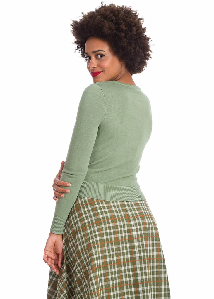This cardigan, that closes with smooth flower buttons in the front, ends around your hips. you can wear her with trousers, but she also looks great tucked into a skirt for a sweet 50’s look!