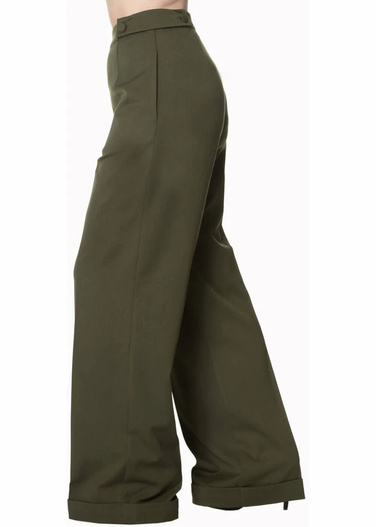 Her high waist is adorned with decorative buttons on the sides, where she also closes with a zipper. Pockets and fake-pockets on the bottom are a must, and the trouser legs have creases and rolled-up seams to make your legs look endless.
