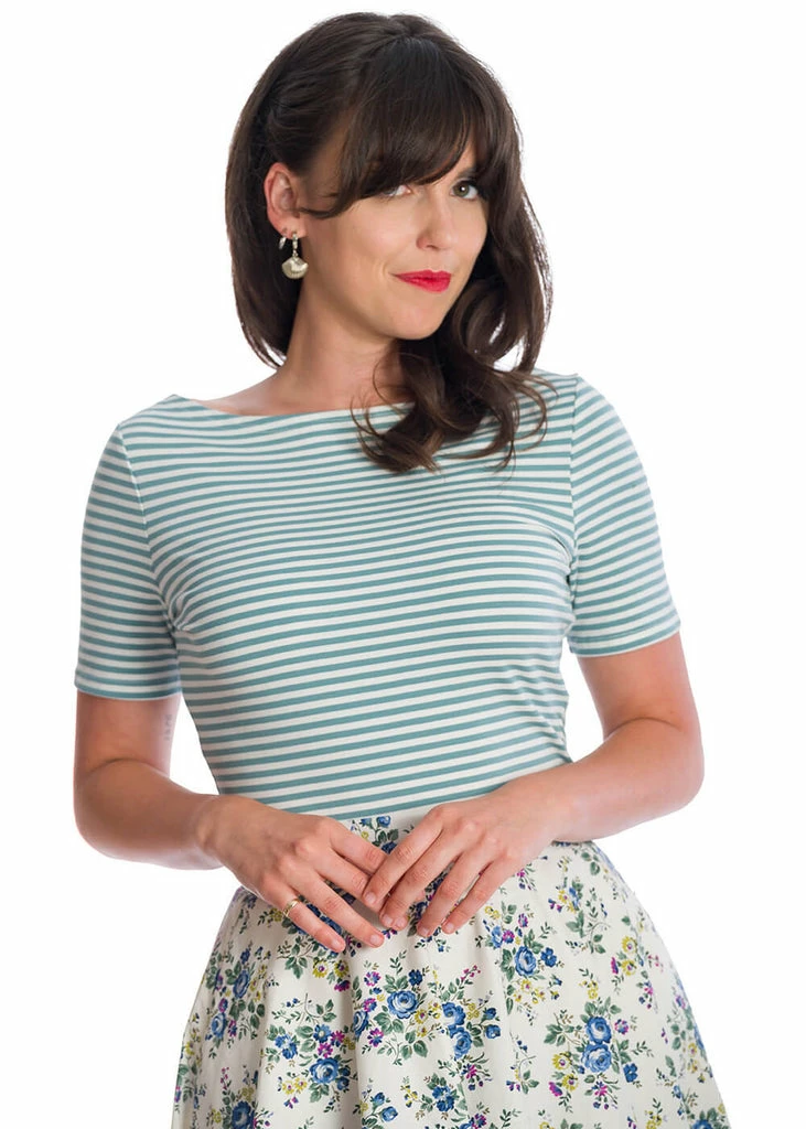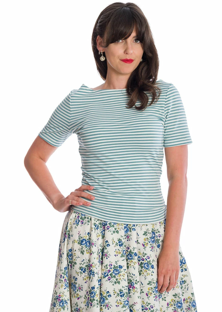 This cheerful looking top is made out of 100% cotton with a lovely stretch, making you want to wear her underneath or on top of every skirt or pair of trousers you have. 40s nautical, 60s Bardot and everything inbetween, this cutie is indispensable for your wardrobe!