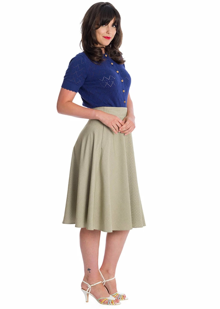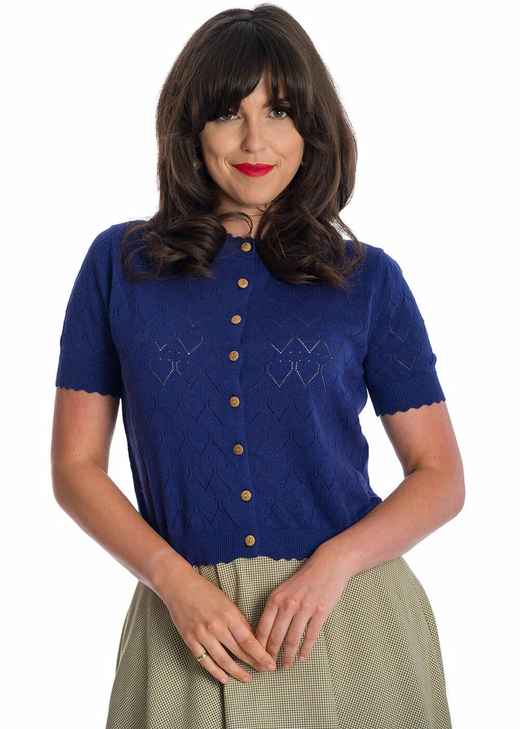 This cutie will make your summer extra sweet, with the pointelle heart pattern all around, which becomes even more loving with the wooden buttons she closes with… As we’re used from Banned, this beauty is made of a lovely viscose-mix, giving her fine stretch and making her nice and cozy. The neck, the short sleeves and the bottom seam are decorated with wavy edges, which are ribbed for a classic 40’s fit.