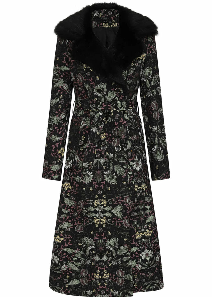 Her faux-fur collar feels incredibly soft and is removable, as if anyone would want that 😉 This gem has a double row of buttons on the front and a removable sash accentuating the waist. From there she flares lovely and ends below the knees for a height of 1,70 m. She is completely lined and not padded, pockets are a must, too.