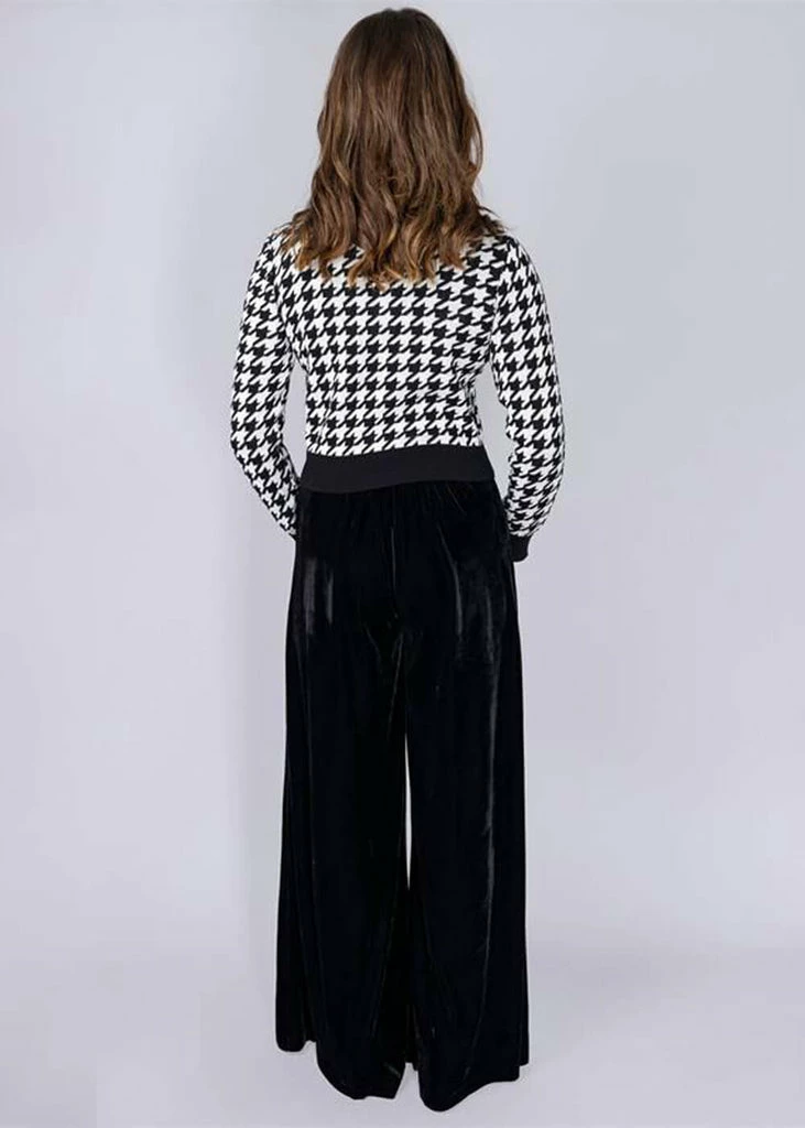 This beauty is worn in the waist, where she flares from the waistband (that is elastic in the back) into lovely wide trouser legs with pockets. Her pitchblack velvet has fine stretch and is supersoft. Pair her with a top or an elegant blouse and you’re ready to lounge in style, whether that is at the cocktailbar or on the couch.