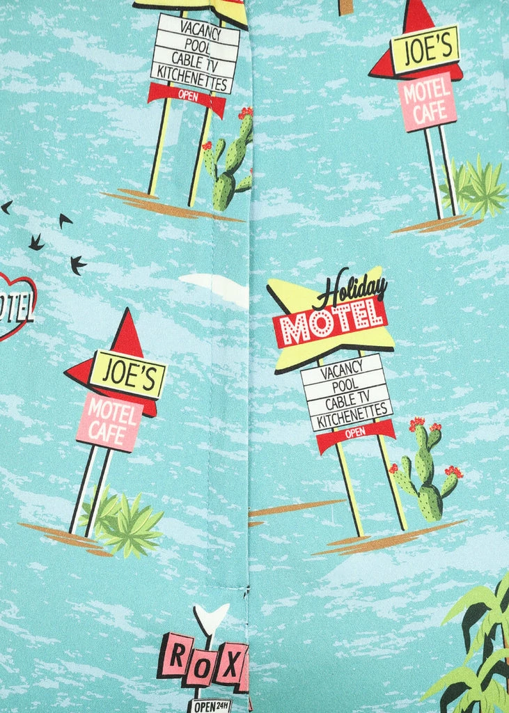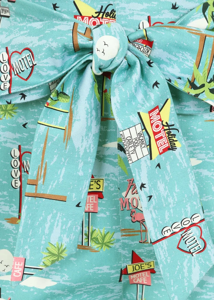 The kitchy Motel-print on this stunning cotton-mix with slight stretch is the Rock ‘n Roll jackpot, of course. Eugenia has a high waist, that you accentuate with the detached belt that you can tie, and goes on close-fittting until just above the ankles for a height of 1.70m. She closes with a zipper in the front. Pair her with a cool t-shirt or jumper and you’re ready to swing those hips 😉