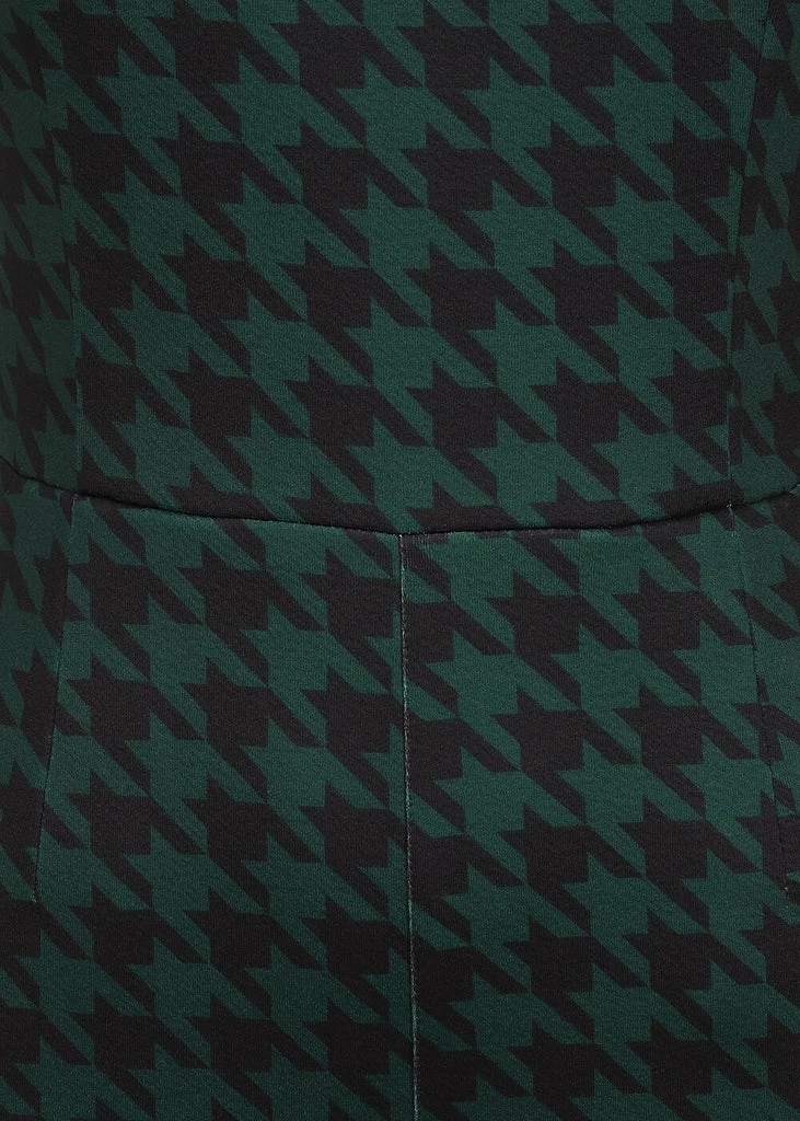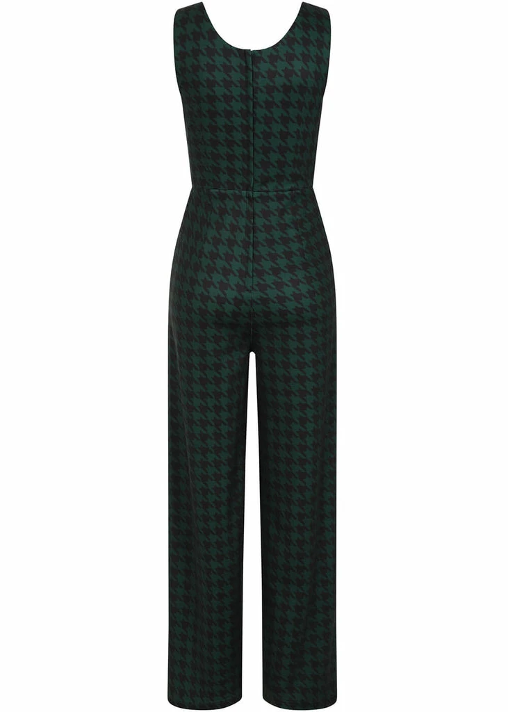 A stunning jumpsuit, with her round neckline and stylsih houndstooth pattern. Made of a strong but smooth fabric with stretch and figure seams, she is lovely closefitting until the waist. From the waist seam, she transforms into long wide trouserlegs with pockets, and she closes with a zipper on the back.