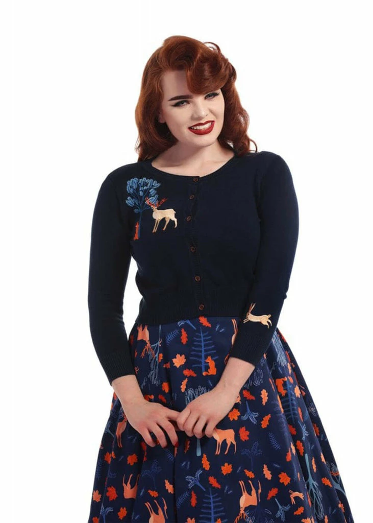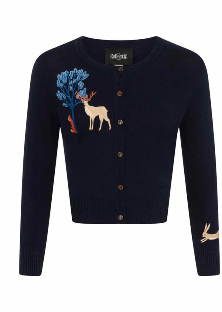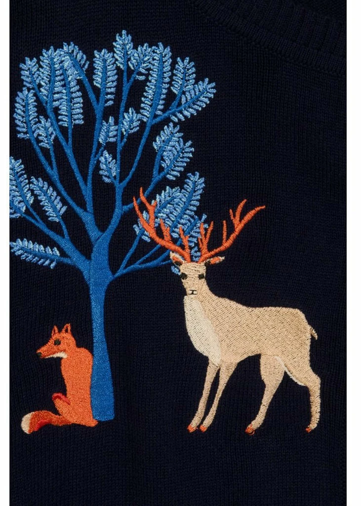 Her stunning dark blue colour with embroided forest animals and a tree makes us all zen… She is made of a lovely soft knitted cotton with stretch, which makes her wear like a dream, while the ribbed edge, bottom and ends of the sleeves make sure all the warmth stays in. The wooden buttons make for the perfect closure.