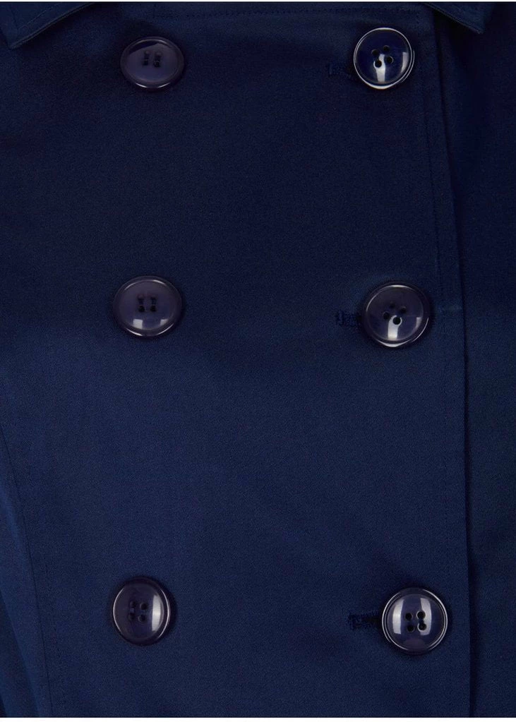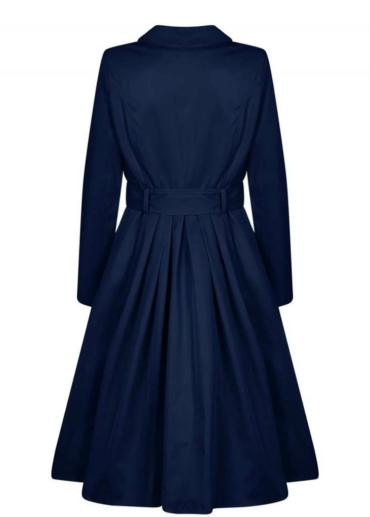 The collar and double row of buttons give a strong look, while the pocket make her practical (and indispensable!). The upper part has princess seams for a perfect fit and the waist accentuated with the loos sash. After that she flows out into a full swing coat, as the back is pleated! The full effect while the front looks calm and simple.