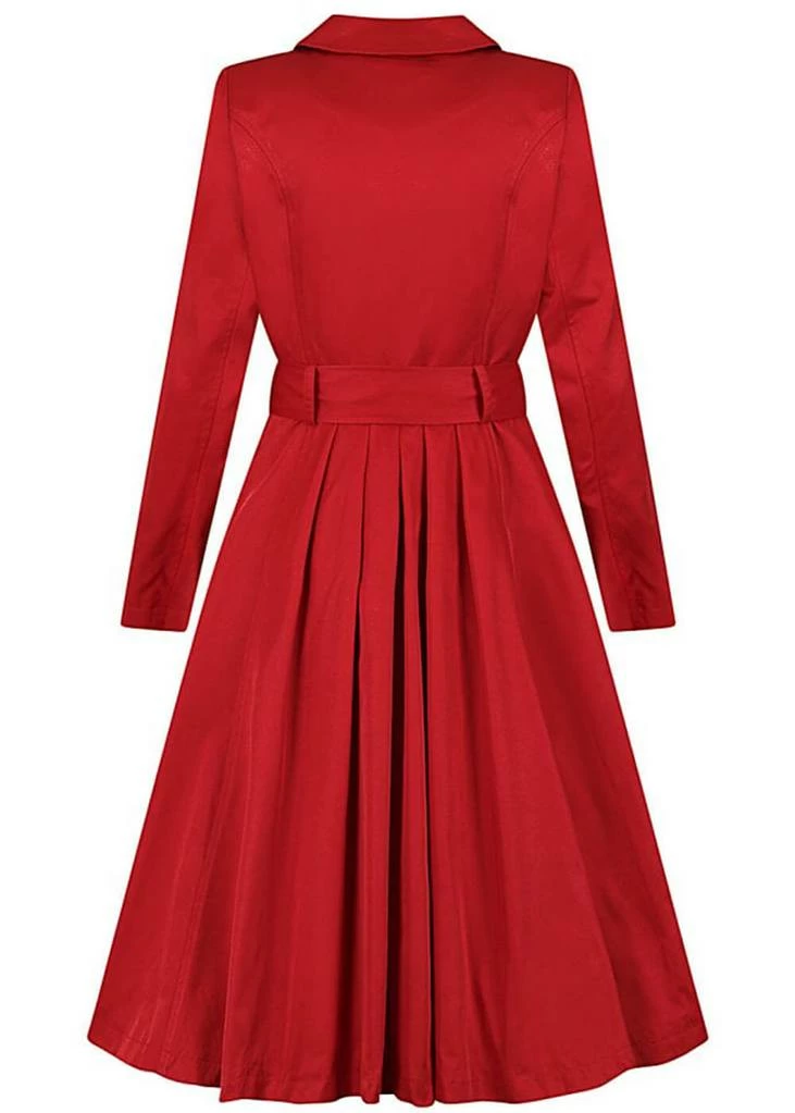 The collar and the double row of buttons give off a strong look, while the pockets turn her into a practical (and essential!) must have 😉 The bodice has figureseams to ensure a beautiful fit and she’s accentuated in the waist by the detachable sash. Down from which she flares out into a full bottom, because the back is pleated! Get that full effect, while the front remains nice and calm.