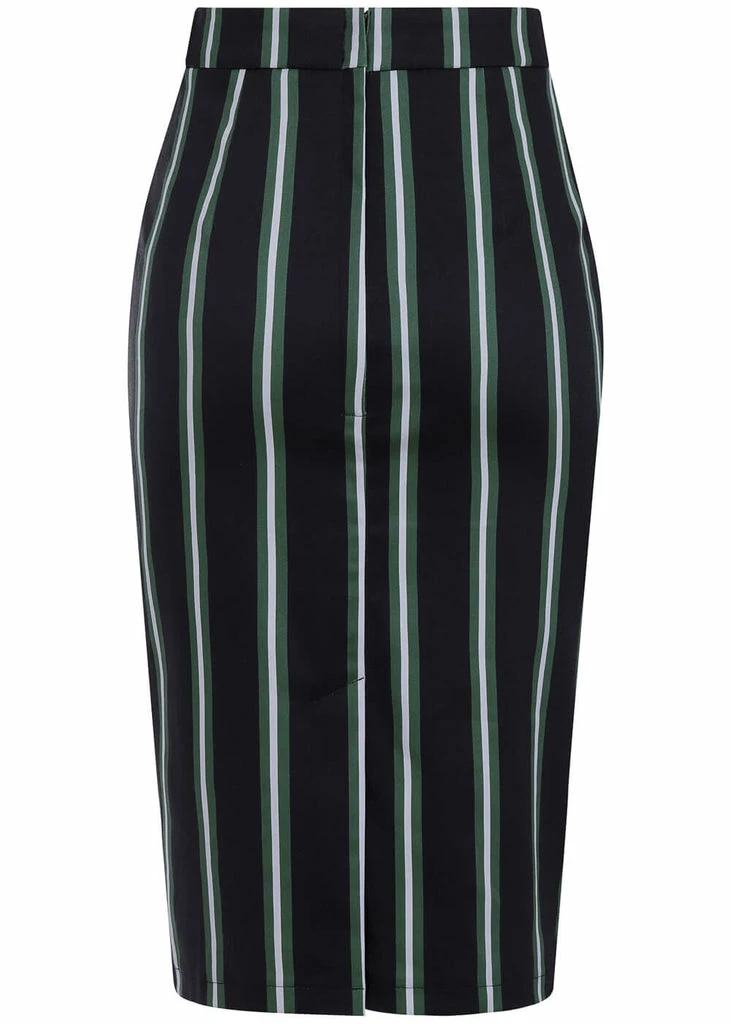 This amazing high waist skirt is made of a stunning cotton-mix with a slight stretch, ensuring a Vavavoom fit. On the back she has a slit, and just above that she has a zipper. With a height of 1,70 she reaches down to the knee.