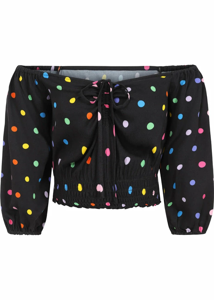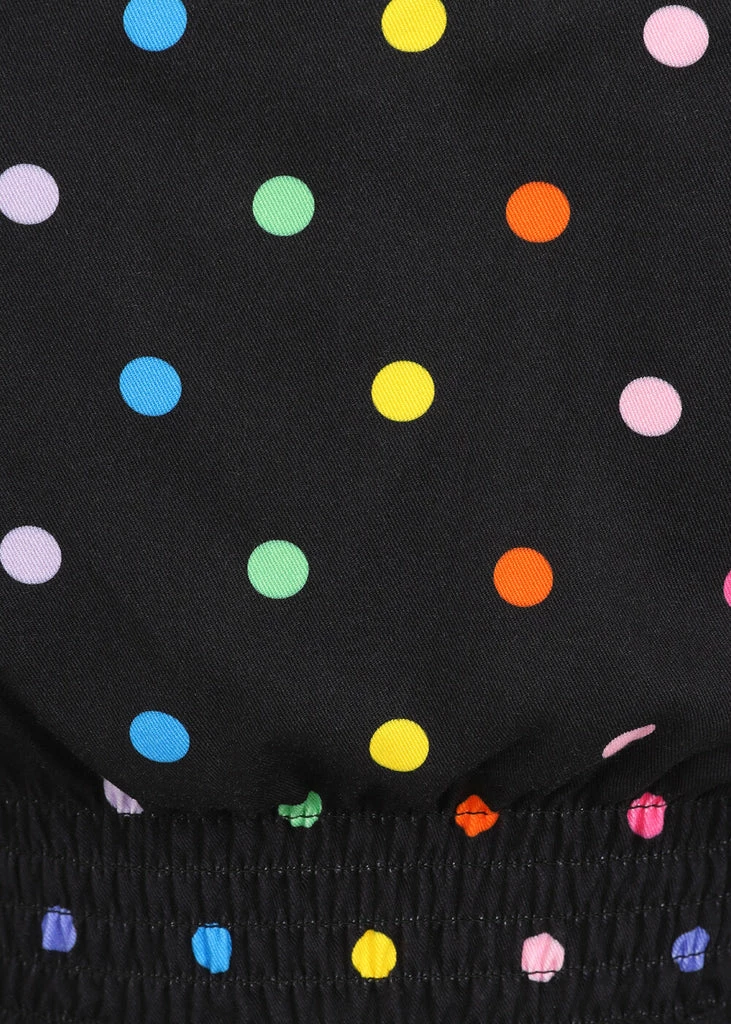 Polkadots on all colours, they’re all there on a background of black viscose. What a lovely relaxed look is created by the elastics in the neckline and the ends of the half-long sleeves, which let you wear her off-shoulder, too! Her waistline is elastic, and since she ends around the waist, you can perfectly wear her with a high waist model or show of a little belly 😉