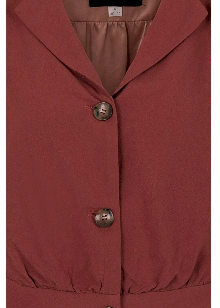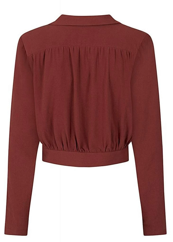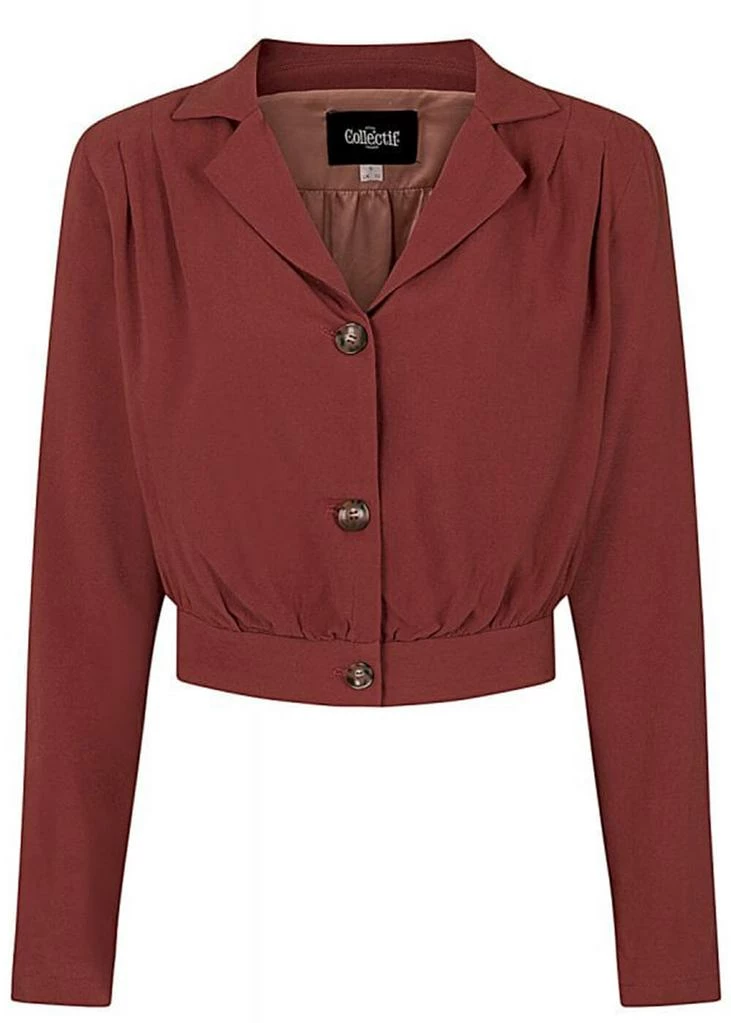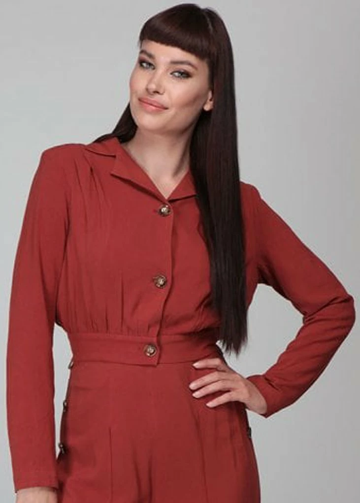 For the tortoise-look buttons alone you’ll fall head over heels! Her rust brown viscose feels lovely and airy to wear, and is lined. This shorter model comes down to the waist where she is formfitting, and where her pleats flare out into a looser, relaxed model. She even has slight shoulder pads for an authentic, strong look! An extraordinary piece that, as a vintage-lover, you don’t want to miss.