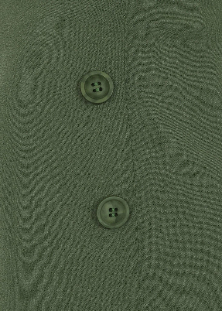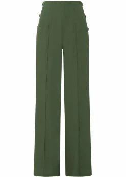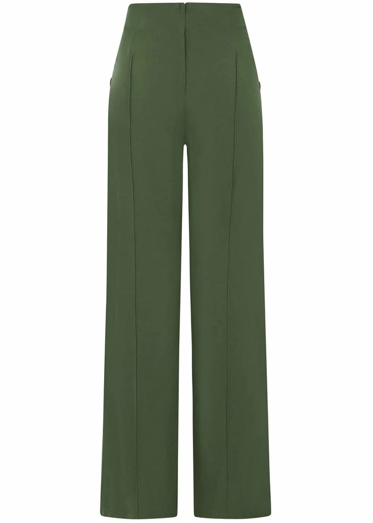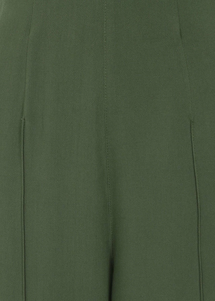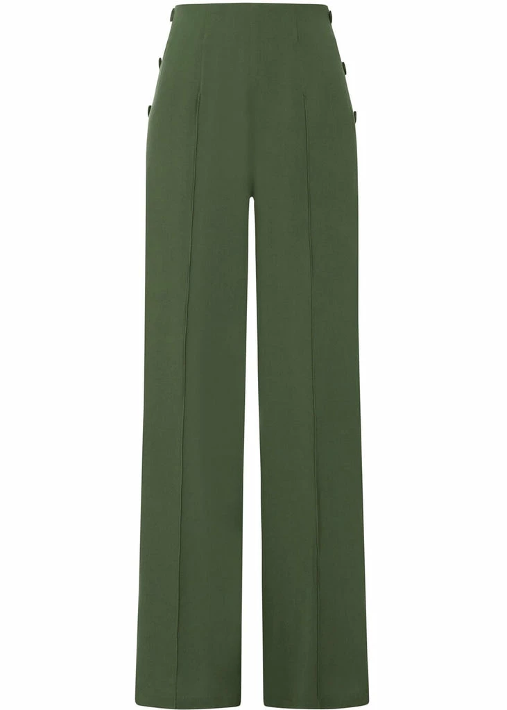 For the tortoise-look buttons on the sides alone you’ll fall head over heels! Her green viscose-mix feels lovely and airy to wear, making the wide trouserlegs cheerfully sway along with your moves. Because of the figure seams in the waist she’s beautifully formfitting, down from which she flares out into those full trouser legs. She closes with a zipper on the back.