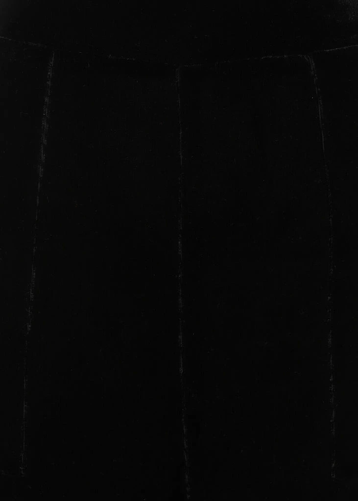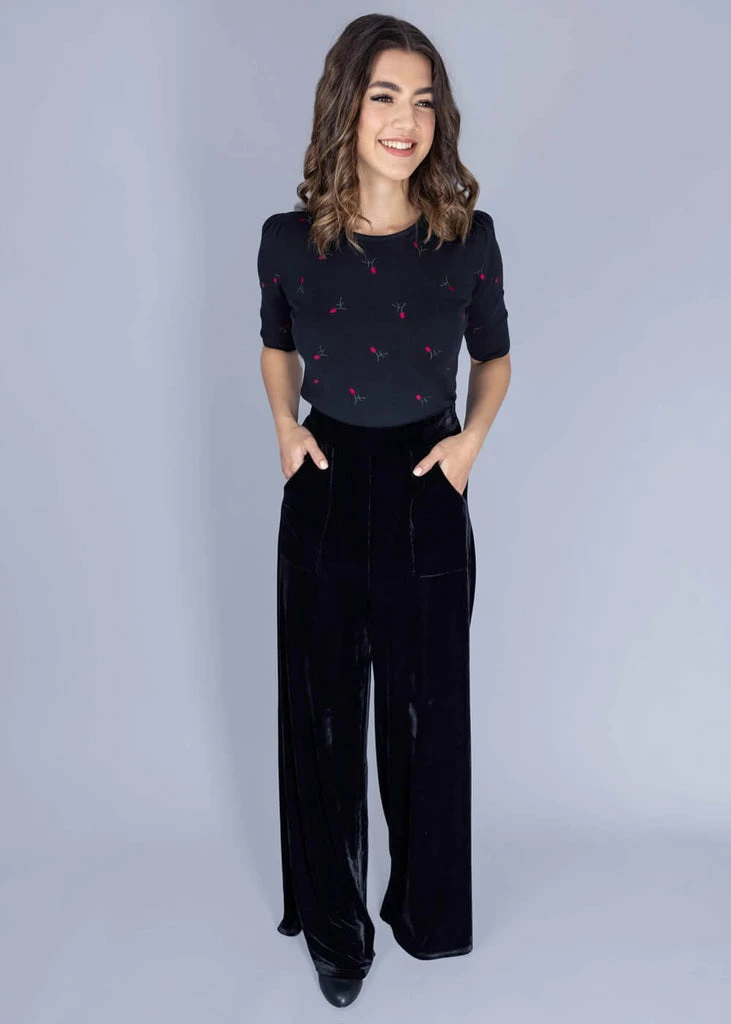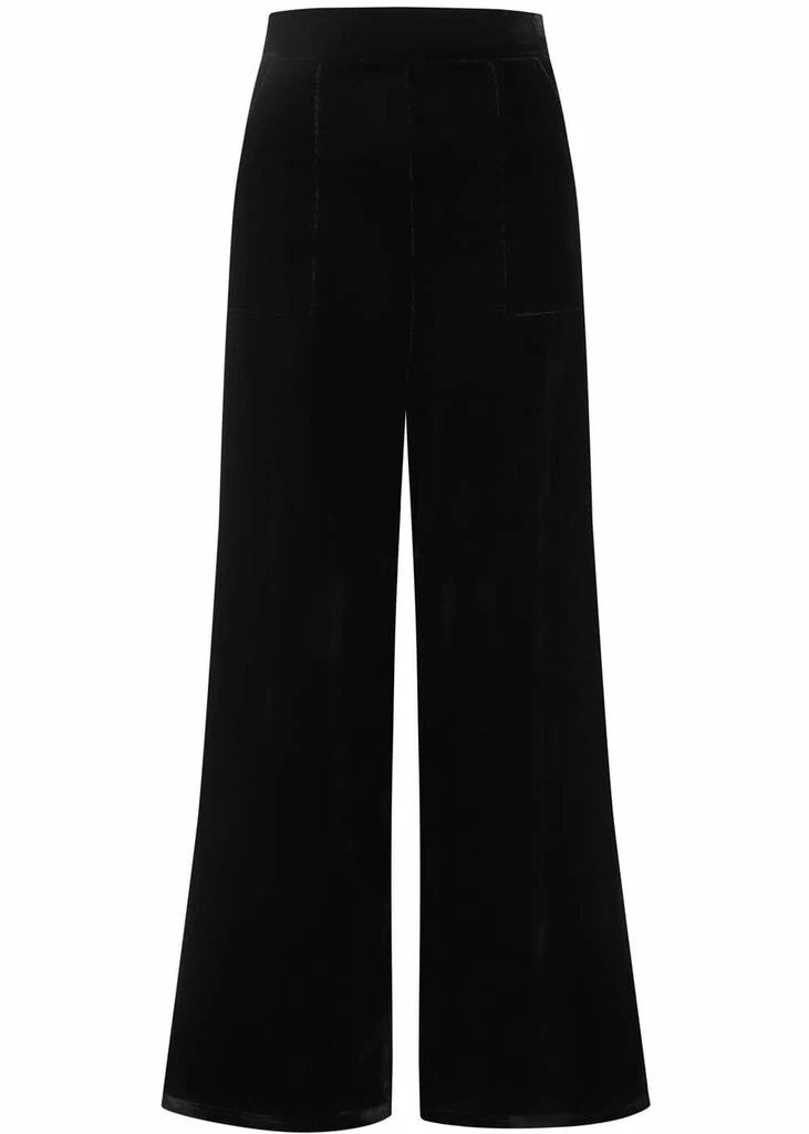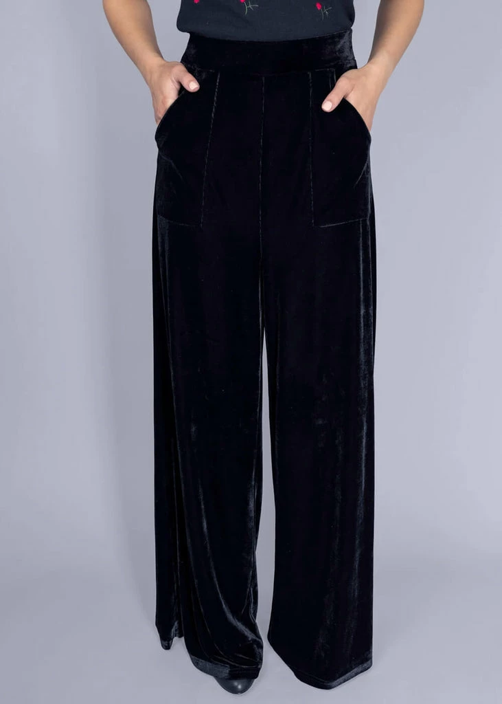 This beauty is worn in the waist, where she flares from the waistband (that is elastic in the back) into lovely wide trouser legs with pockets. Her pitchblack velvet has fine stretch and is supersoft. Pair her with a top or an elegant blouse and you’re ready to lounge in style, whether that is at the cocktailbar or on the couch.