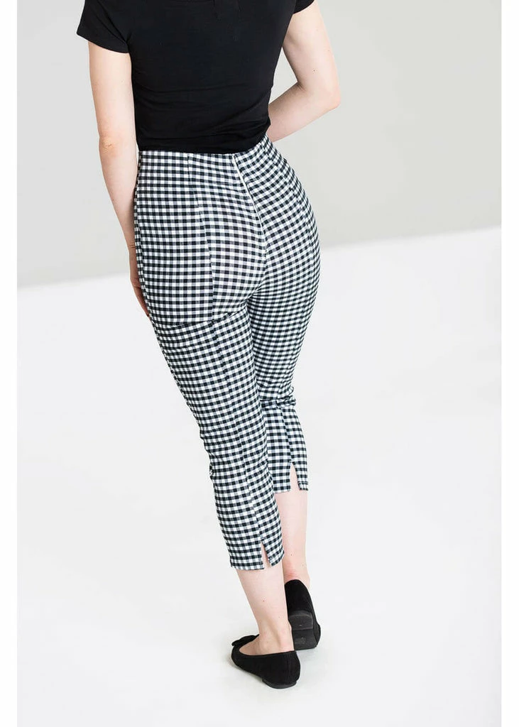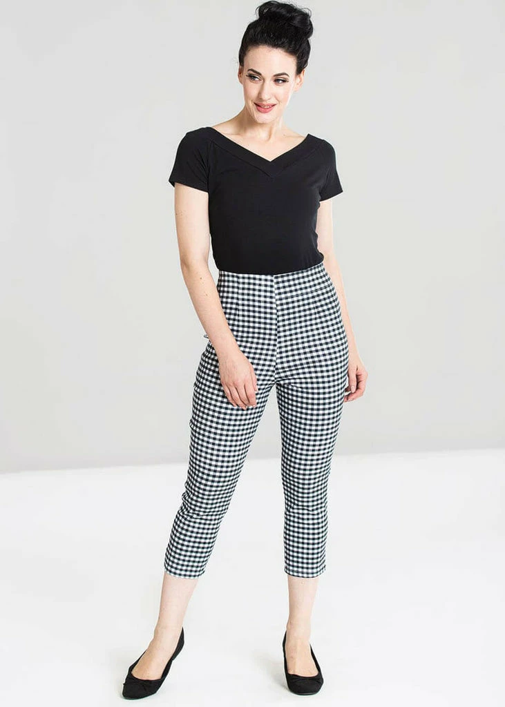 Don’t feel like wearing shorts but still want an Oh La La pin-up look? Capri trousers are the answer, especially these high waist models by Hell Bunny! Because of the rayon/nylon mix she has amazing stretch without showing lines. The waistband and the figure seams ensure a beautiful fit. She closes with a zipper on the back, where the bottom of the trouser legs each have a slit.