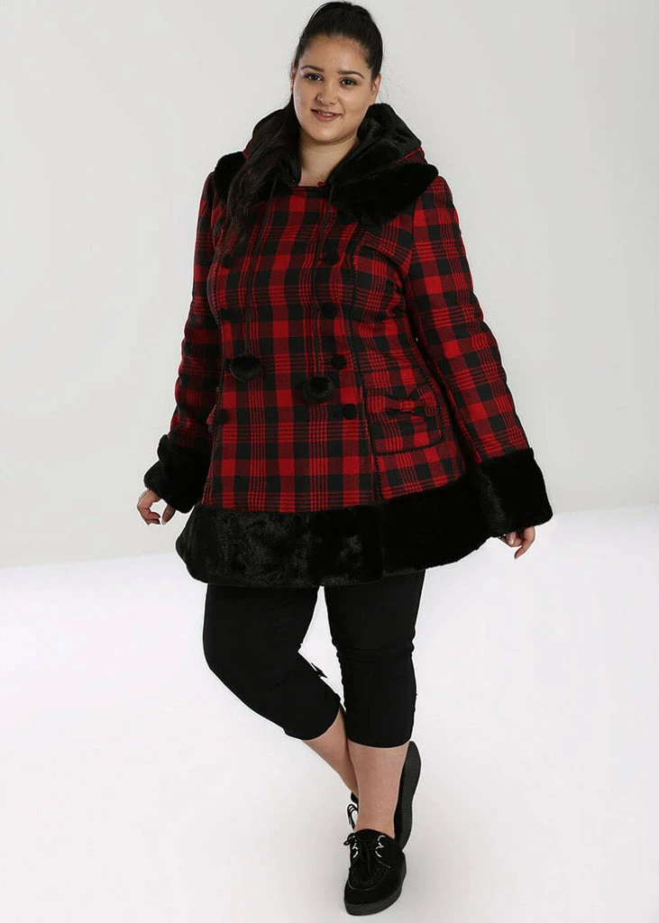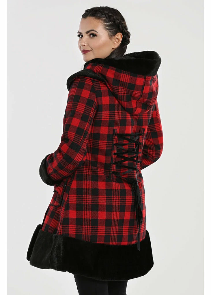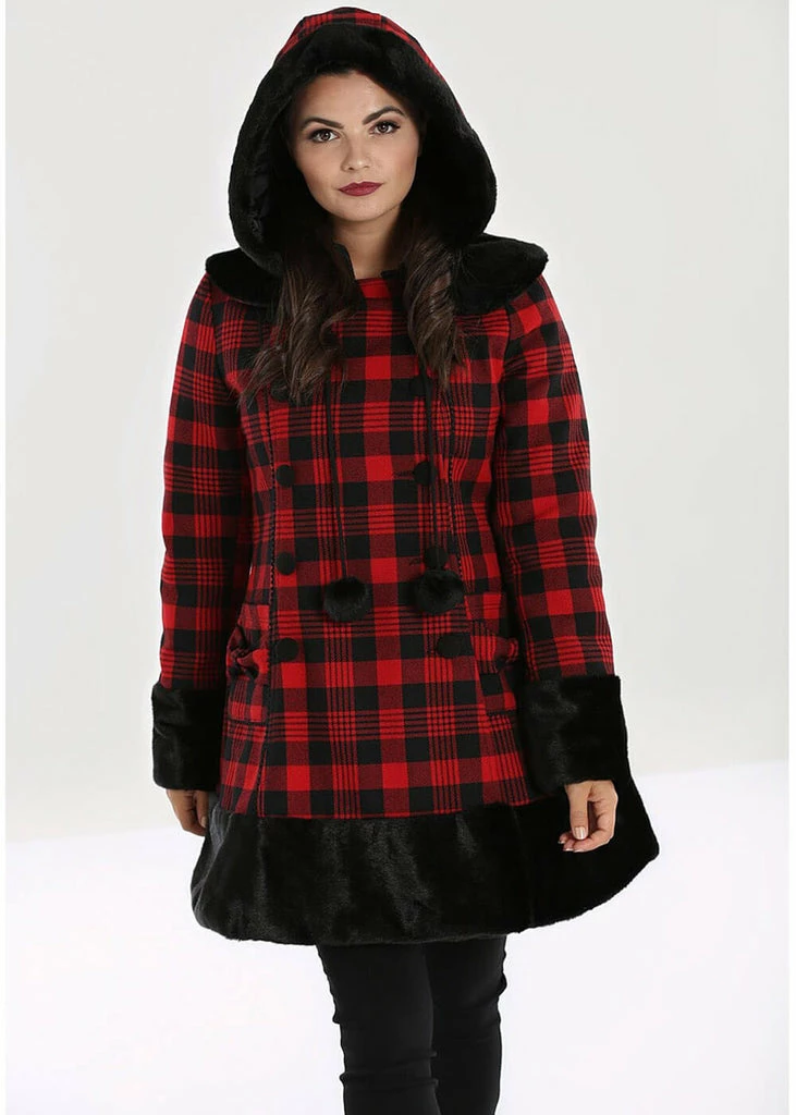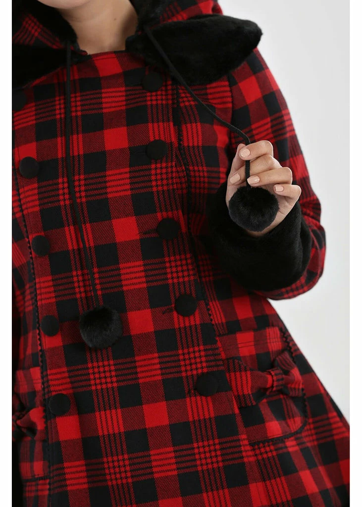How could it be different with all those details: Like the pockets, that are adorned with big bows , and of course the cozy looking black and red tartan! The fluffy faux-fur runs along the ends of the long sleeves and the whole bottom, even the removable hood and the little collar underneath are covered in it. And to top it all off: The cute laces with pompons! Katie closes with one of the two rows of 5 coated buttons each.