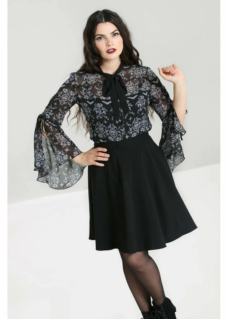 This extraordinary pretty blouse is made of an elegant semi-transparent chiffon without stretch. The special sleeves are open from the ellbows and dance along when you move your arms. The pussybow is a wink towards the 40’s. She closes with smooth buttons in the front.