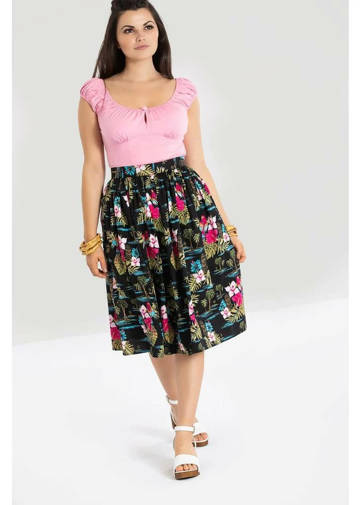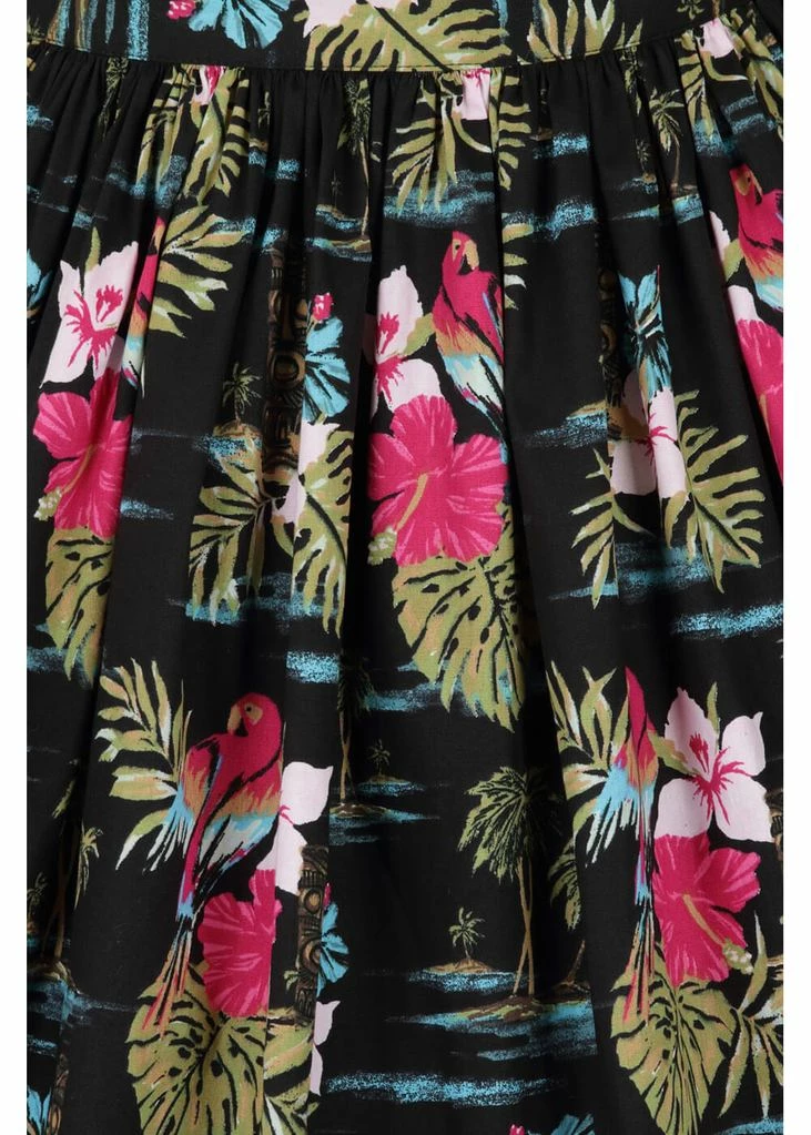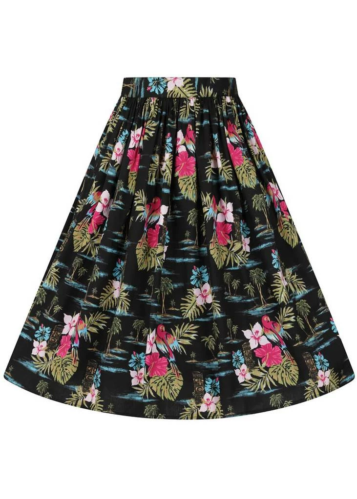 Rockabilly, tiki or just excited for summer, an exotic print such as this is always welcome! From the waistband, through pleats she flares out into a full skirt with pockets(!), which is perfect for wearing with one of our petticoats to make that print come to life. With a height of 1,70 she reaches down over the knee and closes with a zipper and button on the back.