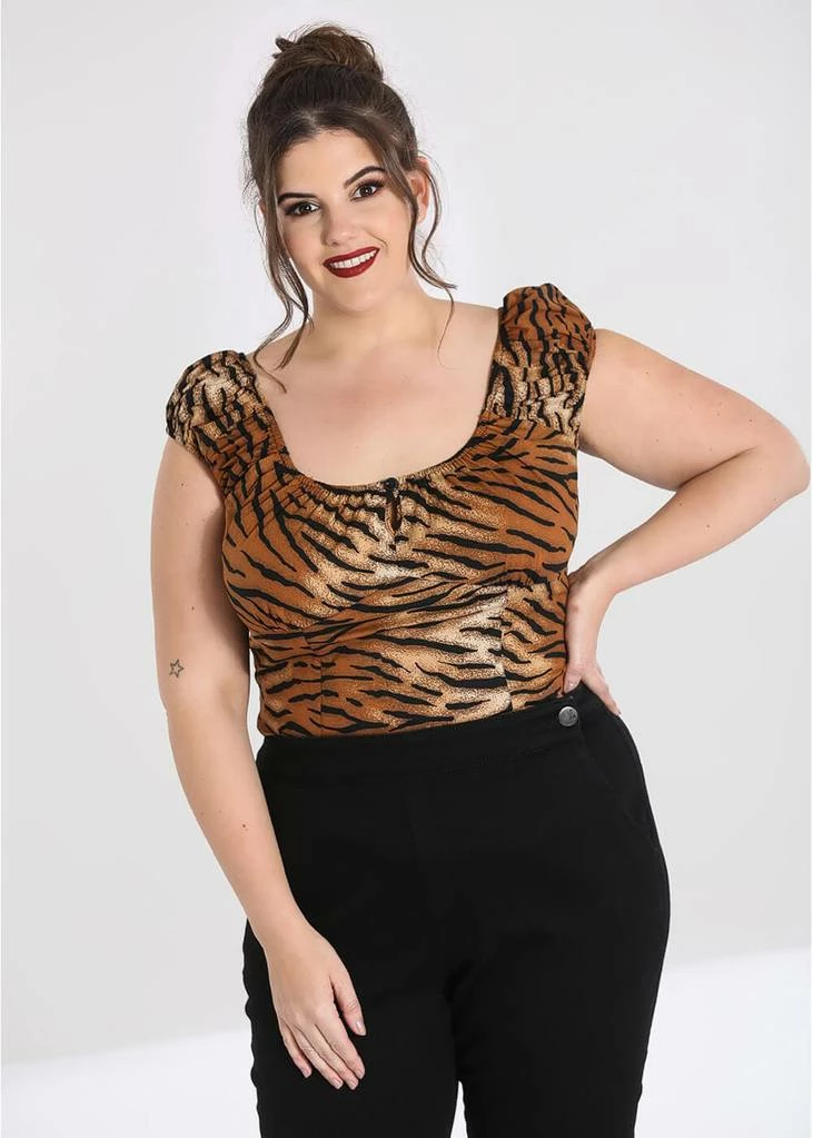 This cutie by Hell Bunny has elastic across the entire top, for a seductive off shoulder look. On the chest she has a button and a playful keyhole, which gives away just enough 😉 She closes with a zipper on the back, which you can completely open up. Length-wise you can wear her with trousers, but she’s also tres sexy with a hight waist skirt.