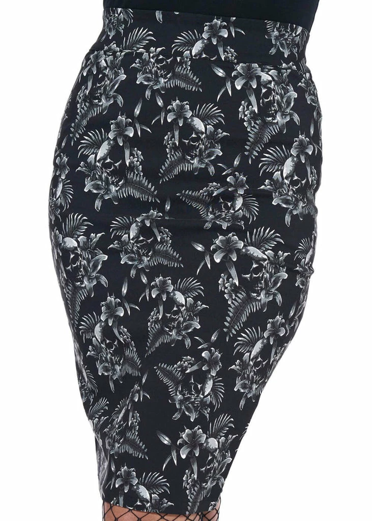Exotic flowers surrounding skulls, on a Vavavoom pencil skirt! This beauty is worn in the waist, from where she turns into a seductive pencil skirt that ends around the knees for a height of 1.70 m. She closes with a zipper in the back, where she also has a split.