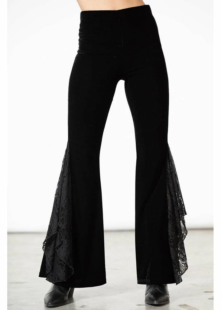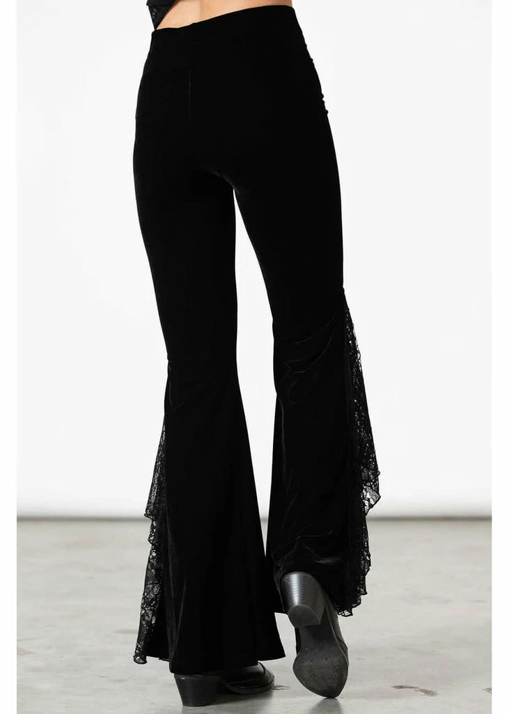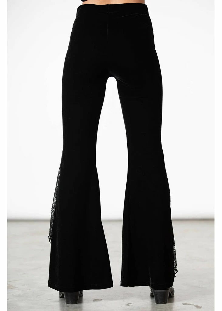 Her pitchblack velvet is supersoft and has fine stretch, setting the scene perfectly for your curves. Thanks to the elastic waistband, you can simply slip in, and she’s long enough for you to wear your highest platforms underneath without any problems. She flares towards the bottom with lace insets, making her perfect for every witchy 60’s or 70’s look as well.