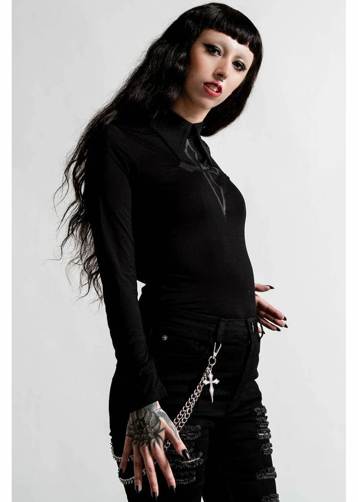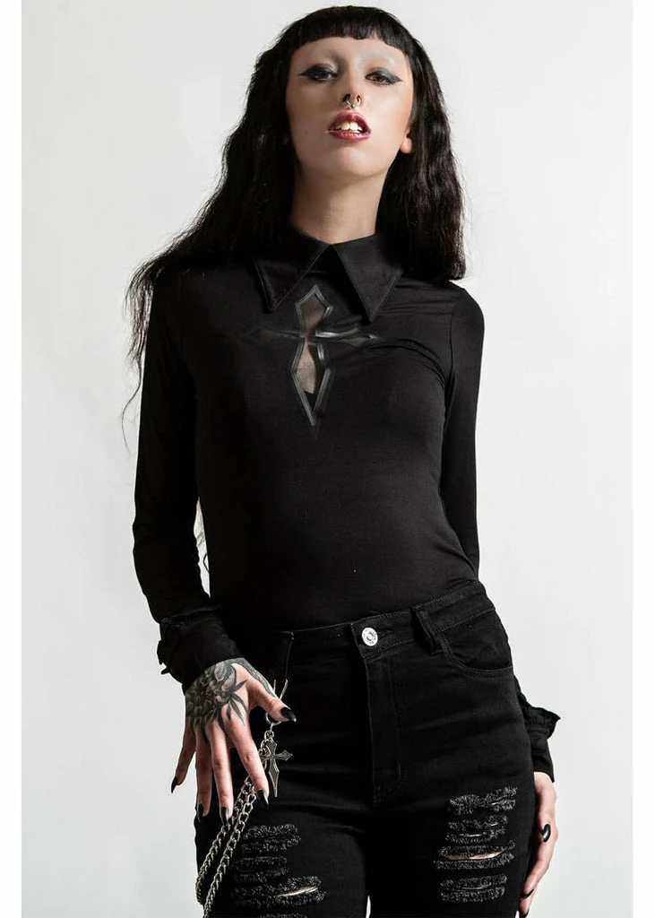 Her Faux-leather and mesh cross makes her a real eyecatcher, while the collar gives her a strong look. She’s made of a smooth but stretchy rayon-nylon-mix that feels soft, making her a joy to wear, too.