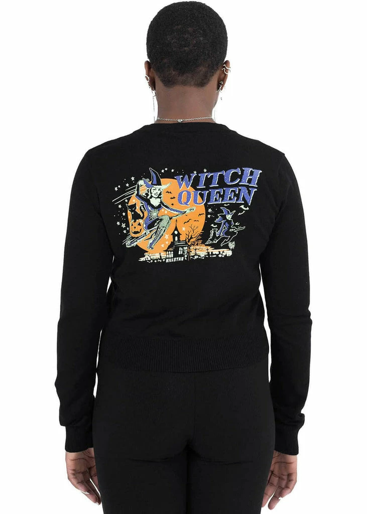 Free your inner Samantha with Witch Queen! The special designs by Vince Ray are shining on the soft fabric with stretch and feels cozy with her v-neck, long sleeves and length until around the hips. She closes with smooth buttons in the front.