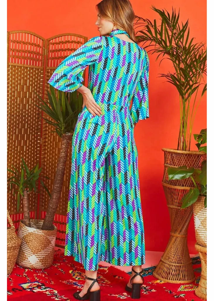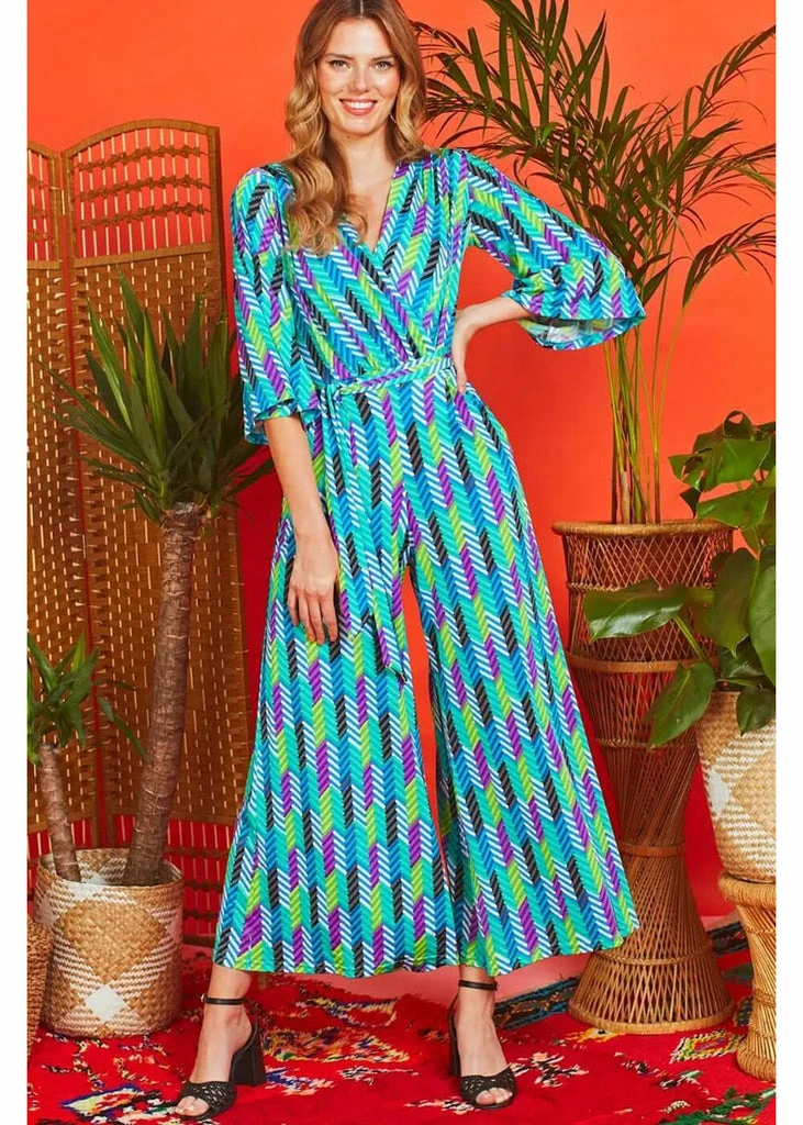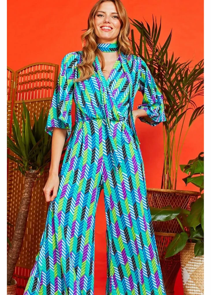 Our favorite jumpsuit has a pleated bodice which continues into a deep v-neck, and doesn’t reveal too much. You can accentuate the waistline using the detachable sash, but you can also use that same sash as a scarf or even a hairband! From there, she flares into wide trouserlegs with pockets, which sway along to your every step. Stylish with some pumps, but incredibly cool with some 70’s platforms!