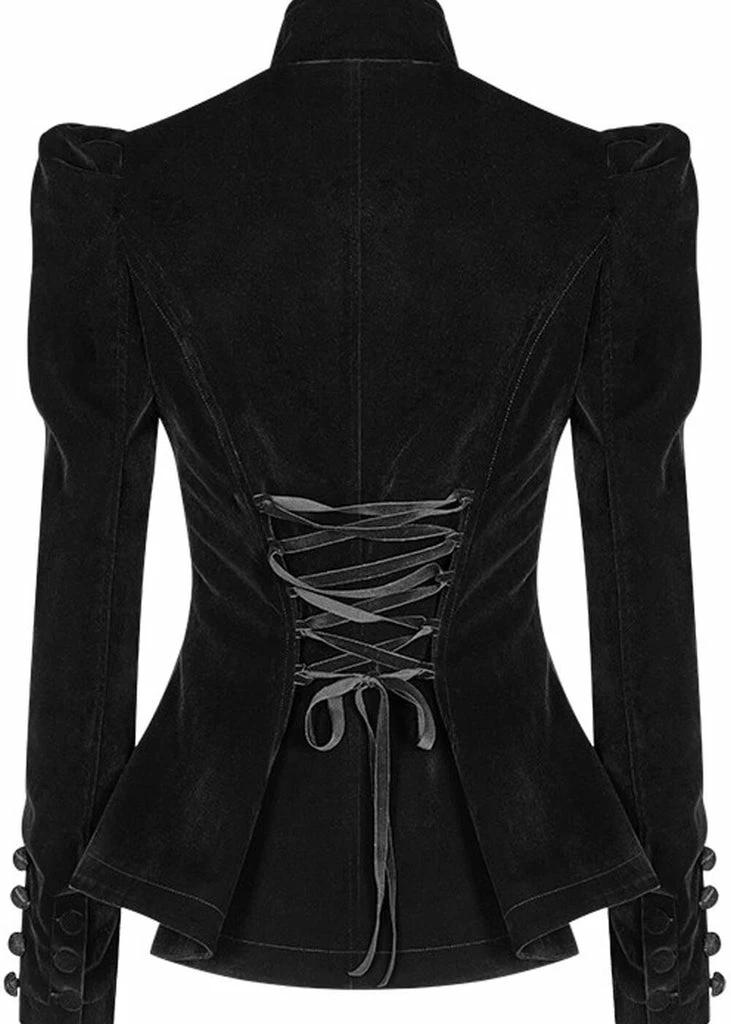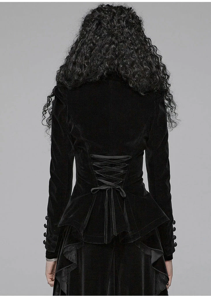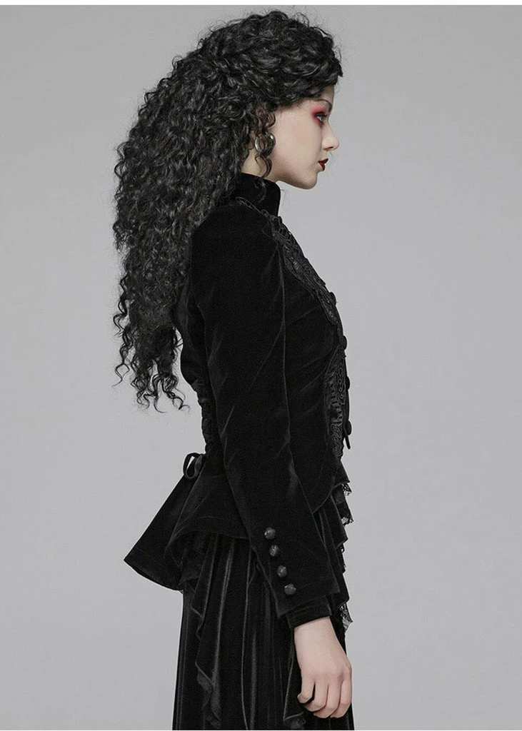 Feel like Vanessa Ives with her pitch black velvet without stretch… She looks like an open blazer and a waistcoat with all her lace decorations, but she is one stunning piece. This jacket is loaded with details like the puffy shoulders thanks to the seams, and the long sleeves with decorative buttons. She closes with coated buttons on the front.