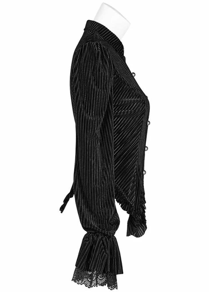 She is loaded with details, from the flaring sleeves with lace to the pointy hem… Her soft striped velvet with slight stretch is a dream to wear and has a lovely fit thanks to the princess seams and the lacing in the back. She closes with eleant buttons in the front. The gem in the pictures with the model is not part of the blouse.